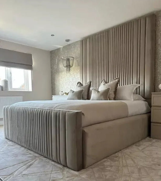 High Headboard Bed Designer Wall Panel Gas Lift Storage Double, King Size, Super king